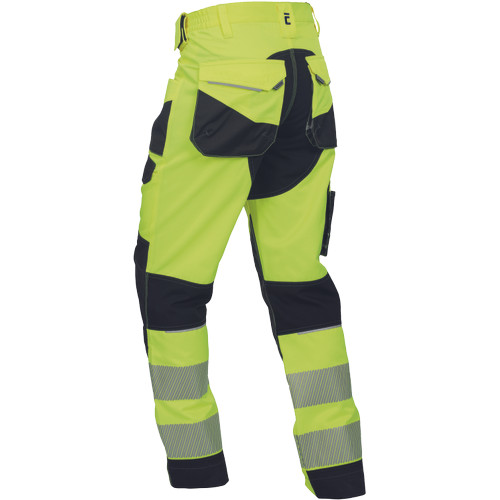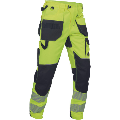• férfi jólláthatósági nadrág rugalmas derékkal és többfunkciós zsebekkel, 7 cm-es nyomtatott fényvisszavető csíkokkal • megerősített térdrész és térdzseb Oxford 600D anyagból térdvédő behelyezéséhez • ellenálló hármas fedőző varrás az üleprészen és a meghosszabbítható szárakon