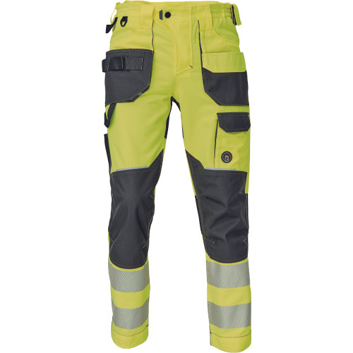 • férfi jólláthatósági nadrág rugalmas derékkal és többfunkciós zsebekkel, 7 cm-es nyomtatott fényvisszavető csíkokkal • megerősített térdrész és térdzseb Oxford 600D anyagból térdvédő behelyezéséhez • ellenálló hármas fedőző varrás az üleprészen és a meghosszabbítható szárakon