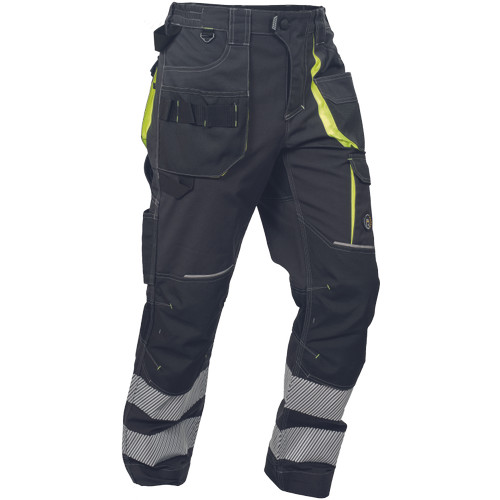 • férfi nadrág rugalmas derékkal és többfunkciós zsebekkel, 7 cm-es szegmentált fényvisszavető csíkokkal • megerősített térdrész és térdzseb Oxford 600D anyagból térdvédő behelyezéséhez • ellenálló hármas fedőző varrás az üleprészen és a meghosszabítható szárakon