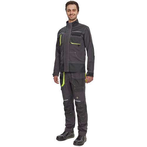 Férfi munkakabát. Cipzárral záródó kabát tépőzáras hajtókával, Oxford 600D megerősítő rátétekkel a váll-és könyökrészeken. 2-2 oldal - és mellzsebbel, 1 e-Secure anyagból készült telefontartó zsebbel. Fényvisszavető elemekkel, kontrasztos varrással.