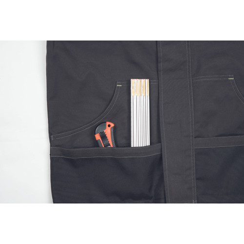 Férfi munkakabát. Cipzárral záródó kabát tépőzáras hajtókával, Oxford 600D megerősítő rátétekkel a váll-és könyökrészeken. 2-2 oldal - és mellzsebbel, 1 e-Secure anyagból készült telefontartó zsebbel. Fényvisszavető elemekkel, kontrasztos varrással.