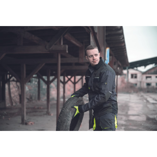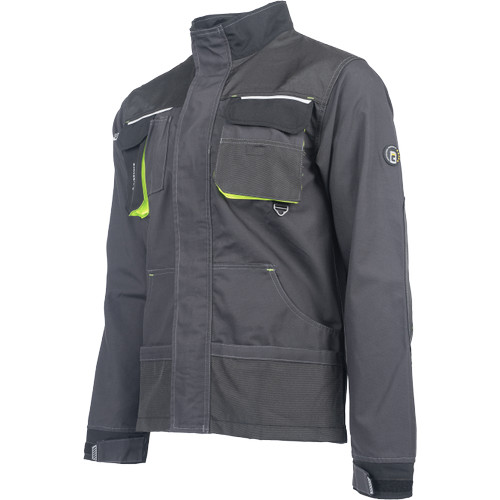 Férfi munkakabát. Cipzárral záródó kabát tépőzáras hajtókával, Oxford 600D megerősítő rátétekkel a váll-és könyökrészeken. 2-2 oldal - és mellzsebbel, 1 e-Secure anyagból készült telefontartó zsebbel. Fényvisszavető elemekkel, kontrasztos varrással.