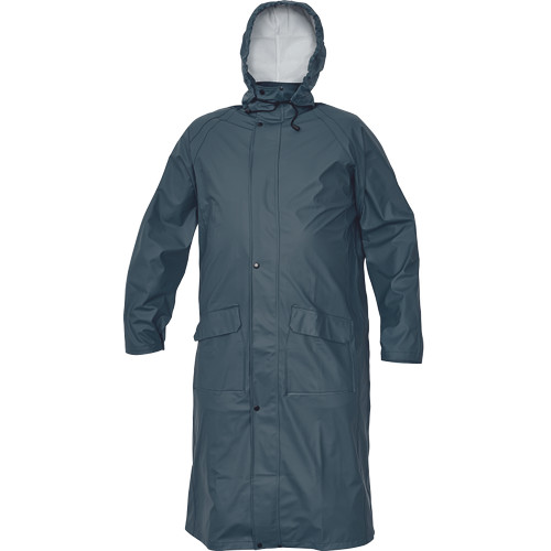 • víz-és szélálló, bő szabású esőköpeny gallérba hajtott kapucnival • hossza: 120 cm • húzózsinórral állítható kapucnival • 2 mély zsebfedős oldalzseb • patenttal szűkíthető mandzsetták
