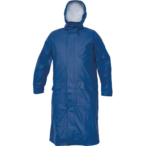 • víz-és szélálló, bő szabású esőköpeny gallérba hajtott kapucnival • hossza: 120 cm • húzózsinórral állítható kapucnival • 2 mély zsebfedős oldalzseb • patenttal szűkíthető mandzsetták