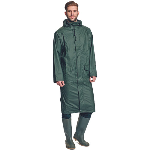 • víz-és szélálló, bő szabású esőköpeny gallérba hajtott kapucnival • hossza: 120 cm • húzózsinórral állítható kapucnival • 2 mély zsebfedős oldalzseb • patenttal szűkíthető mandzsetták