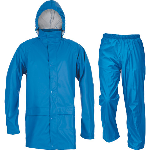 • víz- és szélálló esőöltöny • esőkabát gallérba hajtott kapucnival és rugalmas derekú nadrággal • puha poliészter szövet • 2 mély zsebfedős oldalzseb • patenttal szűkíthető mandzsetták