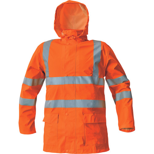 • esőkabát gallérba hajtott kapucnival és rugalmas derekú nadrággal • puha poliészter szövet • 2 mély zsebfedős oldalzseb • patenttal szűkíthető mandzsetták • fényvisszavető csíkok az ujjakon, a vállakon és a test körül