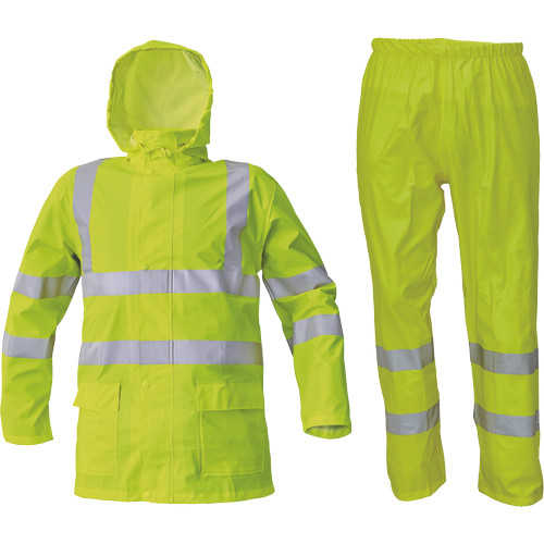 • esőkabát gallérba hajtott kapucnival és rugalmas derekú nadrággal • puha poliészter szövet • 2 mély zsebfedős oldalzseb • patenttal szűkíthető mandzsetták • fényvisszavető csíkok az ujjakon, a vállakon és a test körül