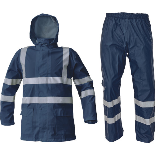 • esőkabát gallérba hajtott kapucnival és rugalmas derekú nadrággal • puha poliészter szövet • 2 mély zsebfedős oldalzseb • patenttal szűkíthető mandzsetták • fényvisszavető csíkok az ujjakon, a vállakon és a test körül