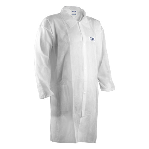 * SPP polipropilén alapanyagú fehér köpeny* 4 patenttal záródó köpeny, gumírozott mandzsettával és klasszikus gallérral* 30 g/m2 vastag, zsebek nélkül* 110 cm hosszó