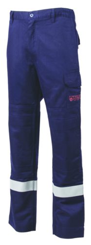 300 g/m2 vastag, 78% pamut + 20% poliészter és 2% antisztatikus alapanyagú sötétkék, vegyszer-, láng-, és íválló, antisztatikus, hegesztő védőnadrág,cipzáras záródás, gumis derékrész övbújtatókkal, bokánál 5 cm-es lehajtható szegés,2 fedett farzseb, 2 oldalzseb, 1 fedett combzseb, 1 zárható szerszámzseb,2 térdvédő zseb állítható nagysággal és alsó nyílással