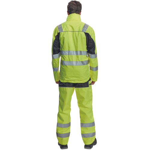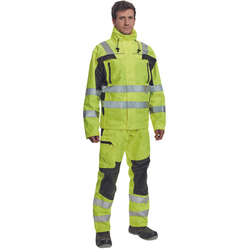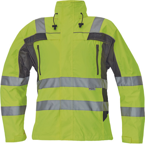 • bélés nélküli kabát jólláthatósági fényvisszavető csíkokkal: EN 471: 3,1 • gallérba hajtott, húzózsinórral állítható kapucnival • lehegesztett varratok, vízálló cipzárak • tépőzárral szűkíthető mandzsetták • húzózsinórral állítható alsó szegély • vízállóság 3. osztály és lélegző képesség 1. osztály az EN 343 szabvány