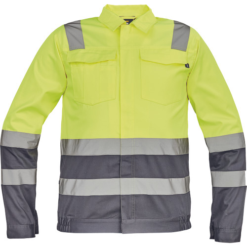 • férfi Hi-Vis kabát 5 cm széles fényvisszavető csíkokkal • tépőzáras hajtókával fedett cipzár • 2 nagy zsebfedős mellzseb • rugalmas oldalsó betétek az alsó szegélyen • tépőzáras mandzsetta