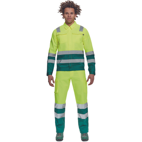 • férfi Hi-Vis kabát 5 cm széles fényvisszavető csíkokkal • tépőzáras hajtókával fedett cipzár • 2 nagy zsebfedős mellzseb • rugalmas oldalsó betétek az alsó szegélyen • tépőzáras mandzsetta