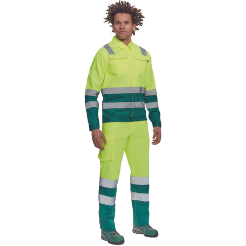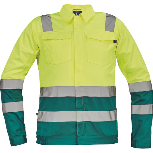 • férfi Hi-Vis kabát 5 cm széles fényvisszavető csíkokkal • tépőzáras hajtókával fedett cipzár • 2 nagy zsebfedős mellzseb • rugalmas oldalsó betétek az alsó szegélyen • tépőzáras mandzsetta