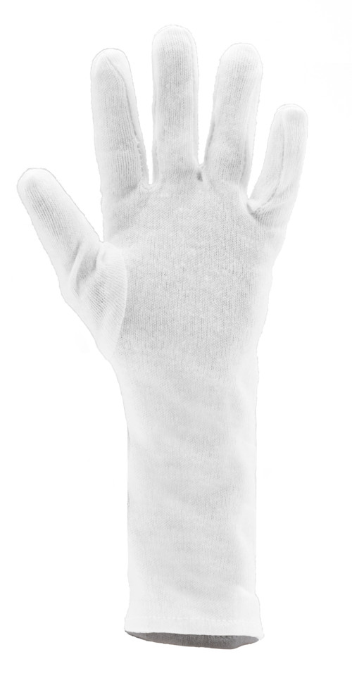 Fehér, varrott kevertszálas alapkesztyűKülön kialakított hüvelykujj betéttelHosszú mandzsetta, 40 cm a kesztyű teljes hossza