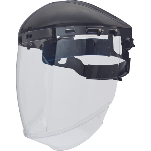 »Víztiszta, 1AT osztályú polikarbonát arcvédő homlokvédővel, ABS fejrésszel, amely az áll környékén fokozott védelmet biztosít. Nagy energiájú, nagy sebességű részecskék, olvadt fém és forró szemcsék ellen véd. Súly: 380 gEN 166, EN 170