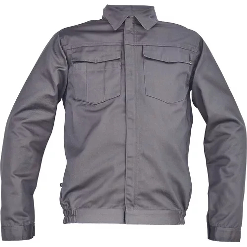• férfi munkakabát • cipzáras, tépőzáras hajtókával • 2 nagy hajtókás mellkasi zseb • rugalmas oldalsó betétek a kabát alján • tépőzáras mandzsetta • 65% PES/35% pamut, 195 g/m2