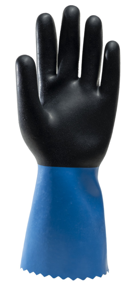 EUROCHEM NE530 fekete és kék színű neoprén vegyszerálló védőkesztyűVarrás nélküli kevertszálas belsőRücskös felületű tenyér, csipkézett mandzsettaVastagsága kb. 0,9 mm,Teljes hossza 350 mm