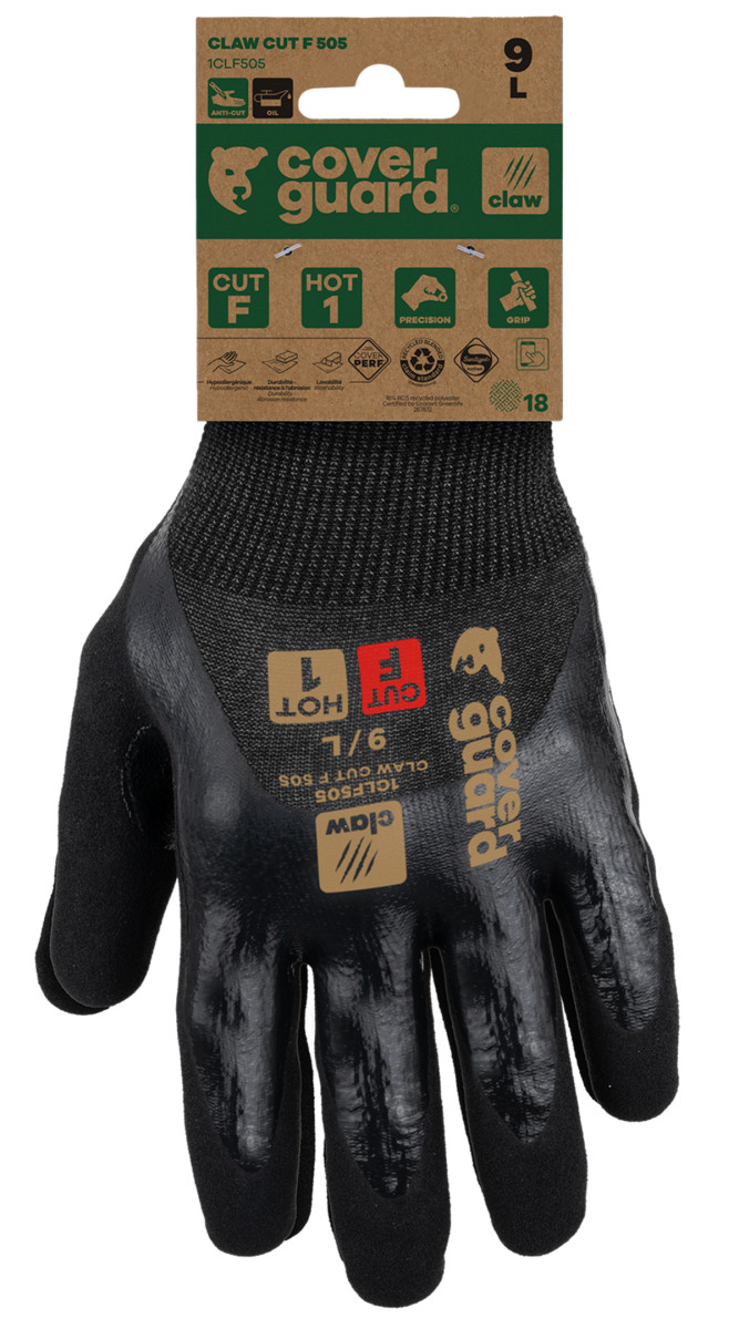 A CLAW CUT termékcsalád egy új generációs vágásálló kesztyű, amelyet a legigényesebb munkákhoz terveztek, magas vágásállósággal (CUT D-től A9-ig), és kiváló kényelmet, valamint kivételes ügyességet biztosít minden munkakörnyezetben (száraz, nedves és olajos).A CLAW CUT F 505 modellt finom anyagmozgatási munkákhoz tervezték száraz és olajos környezetben. A magas 18-as kötés, amely egy rendkívül puha és erős üvegszál, poliészter, acél és spandex alapú anyagból készült, kivételes kényelmet biztosít, miközben maximális vágásvédelmet nyújt (CUT F, az EN388 szabvány szerint).A nitril dupla rétegű bevonat (3/4 sima + tenyér szemcsézett / homokszerű felület) vízálló, és a hosszú megerősítés a hüvelykujj és a mutatóujj között kiváló tapadást és jó fogást biztosít a legigényesebb száraz és olajos munkák során, valamint magas védelmet nyújt a kopás ellen (COVERPERF címke: >20.000 ciklus).A CLAW CUT F 505 újrahasznosított poliészterből készült, és RCS tanúsítvánnyal rendelkezik (a termék teljes súlyának 16%-a). Üvegszál nélkül.Ez a kesztyű érintőképernyő-kompatibilis, lehetővé téve, hogy viselése közben is használja a képernyős berendezéseket.Sanitized kezelés: megakadályozza a baktériumok és szagok fejlődését, és a CLAW CUT F 505 hypoallergén is (COVERPER