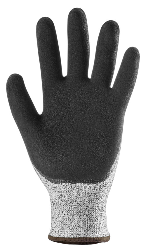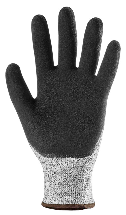Szürke, pettyezett, HPPE-vel, sáványi szálakkal, poliamiddal és elasztánnal erősített varrás nélküli kesztyű.Fekete duplán mártott tenyér, egy sima rétegű és egy érdesített.Kötött mandzsetta.OEKO-TEX® STANDART 100, CQ 1301/1, IFTH minősített