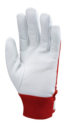 * erezett színkecskebőr sofőrkesztyű* bőr tenyér, hüvelykujj és körömvédő* piros pamutvászon kézhát* tépőzárral állítható elasztikus mandzsetta