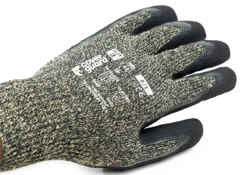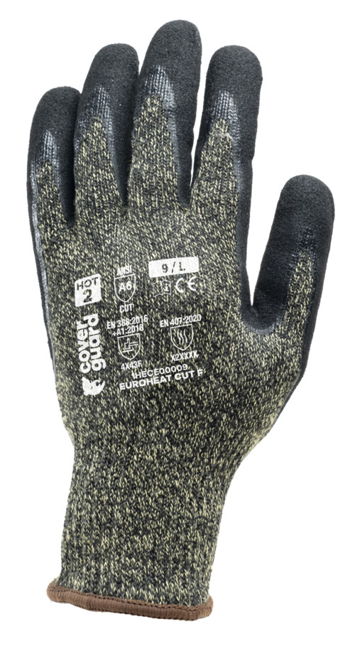 EUROHEAT CUT F 10-es kötésű, varrás nélküli sárga és fekete foltos kötött védőkesztyű, poli-pamut és aramid alapanyagból. Dupla rétegű mártás a tenyéren: sima nitril és sandy csúszásbiztos felülettel, illetve hullámmintás PVC pettyezéssel.