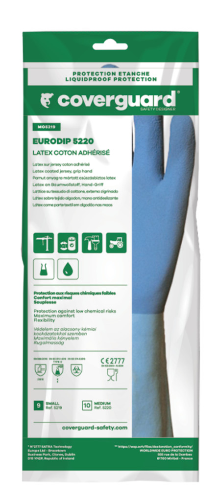 Pamut anyagra mártott kék latex védőkesztyűCsúszás elleni érdesített kézfejrész, 30 cm hosszú, Hosszú, hullámos mandzsetta